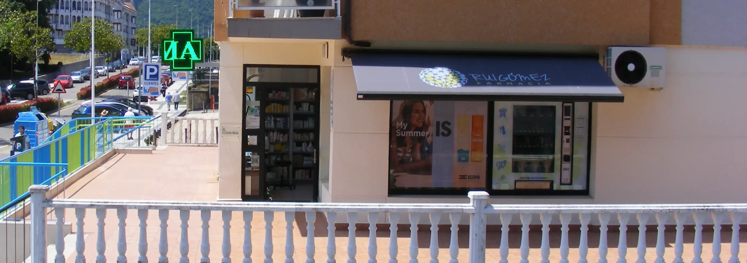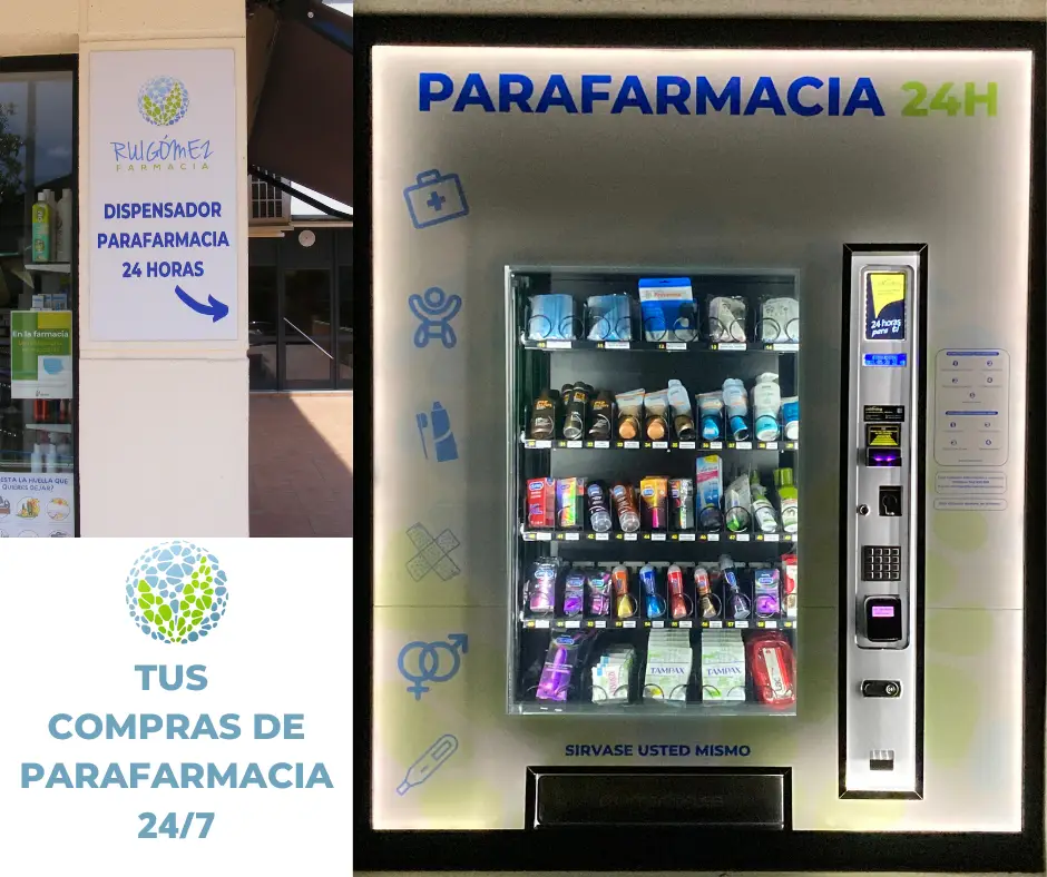 Disponemos de una máquina expendedora de artículos de parafarmacia. Este servicio está disponible 24/7 (las 24 horas del día, todos los días del año).